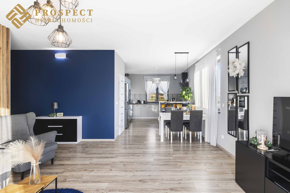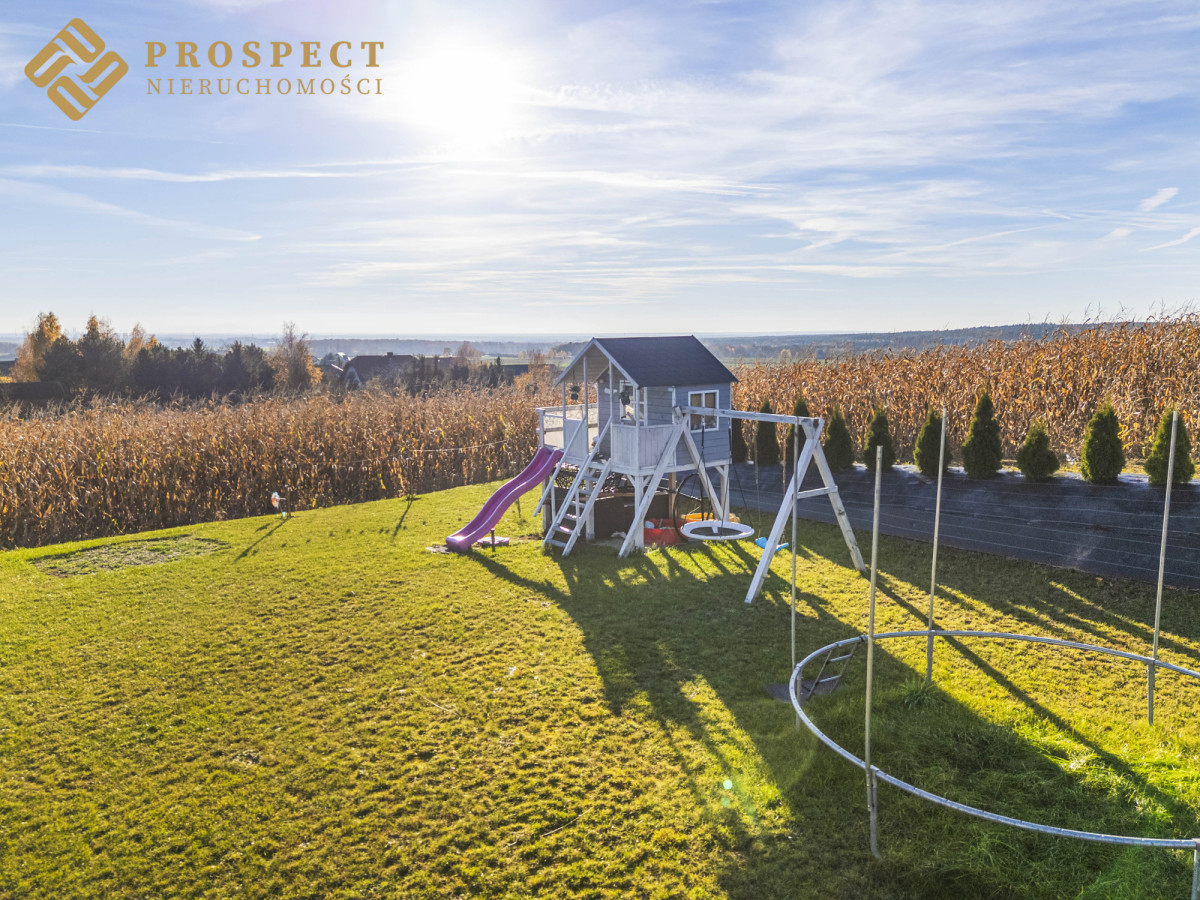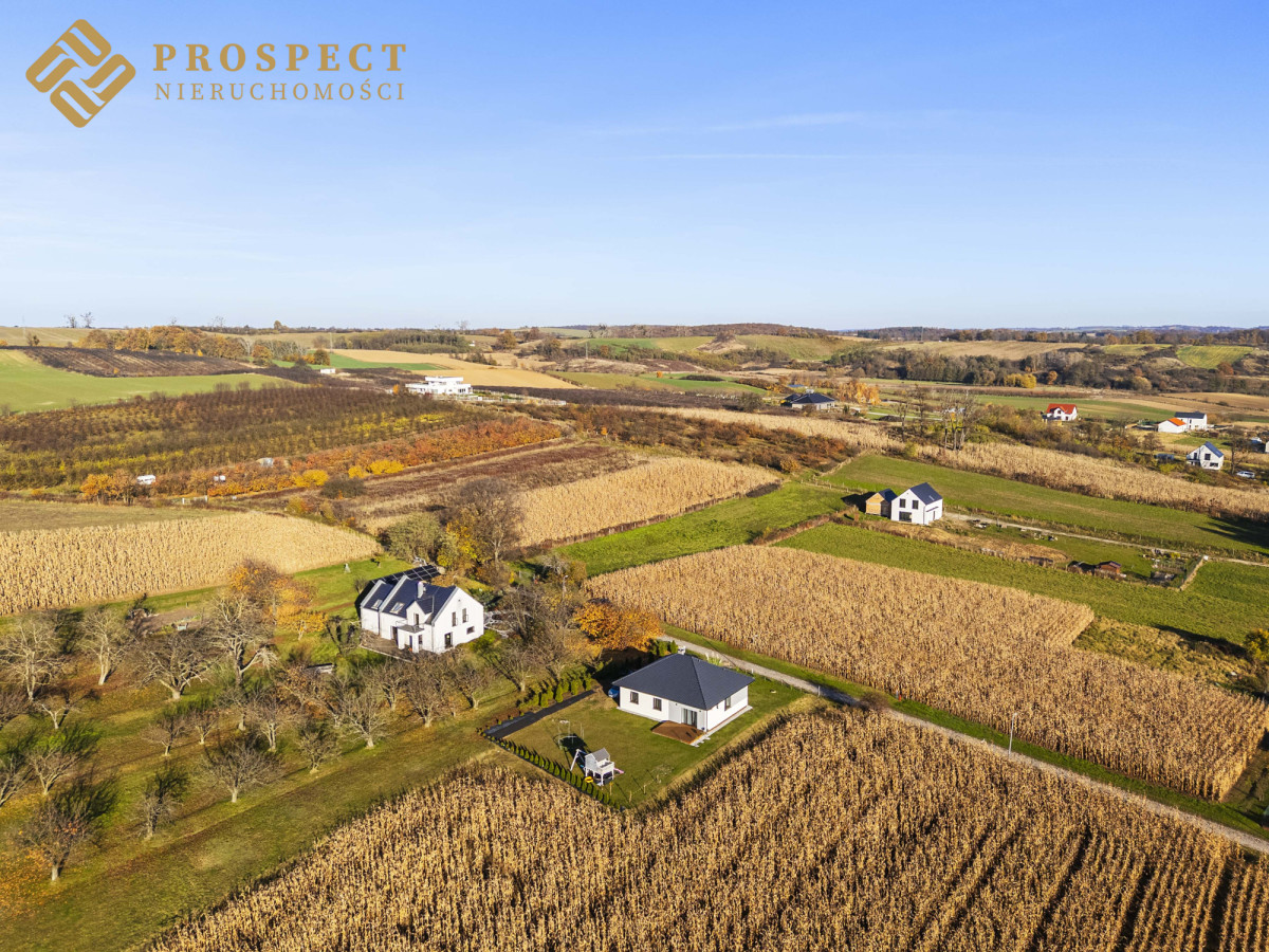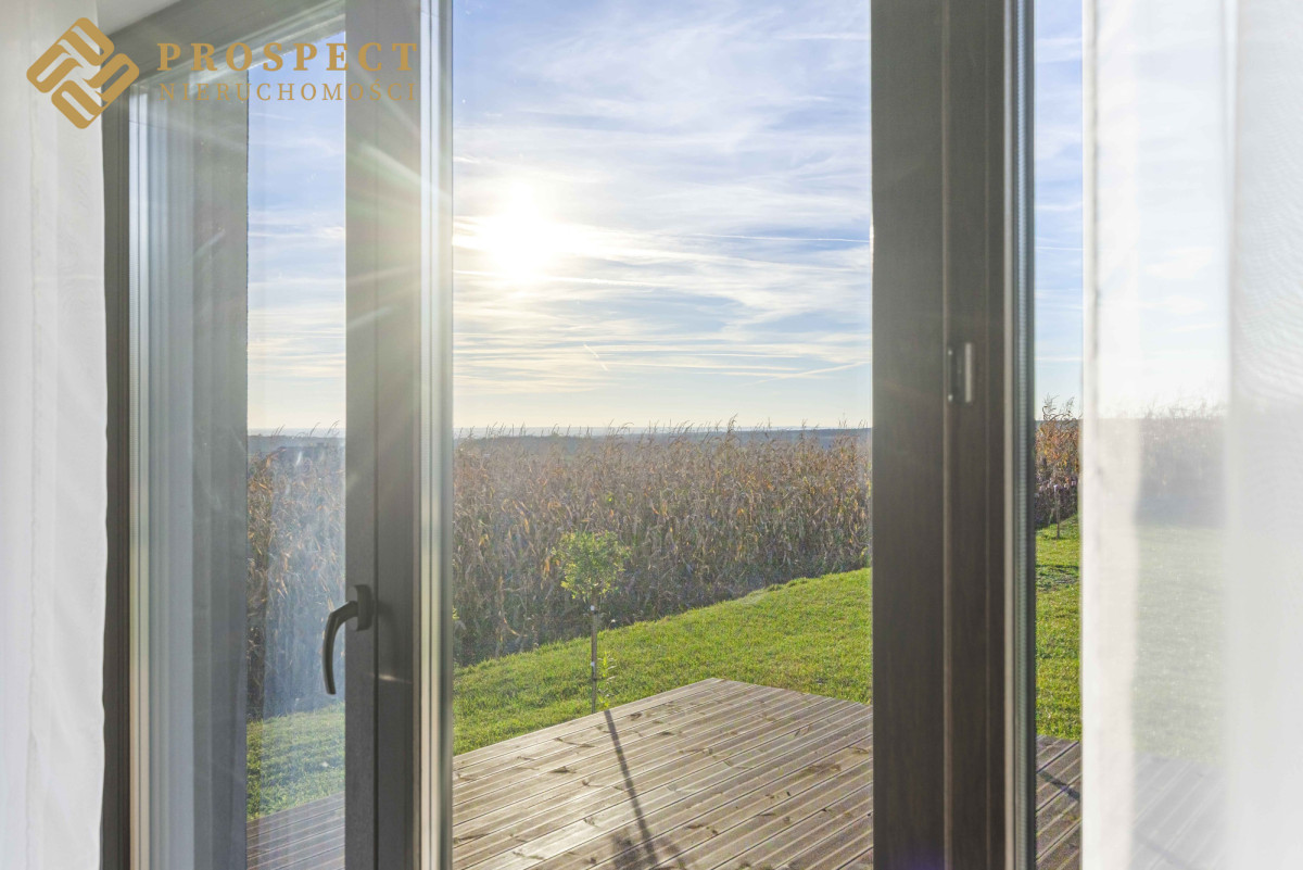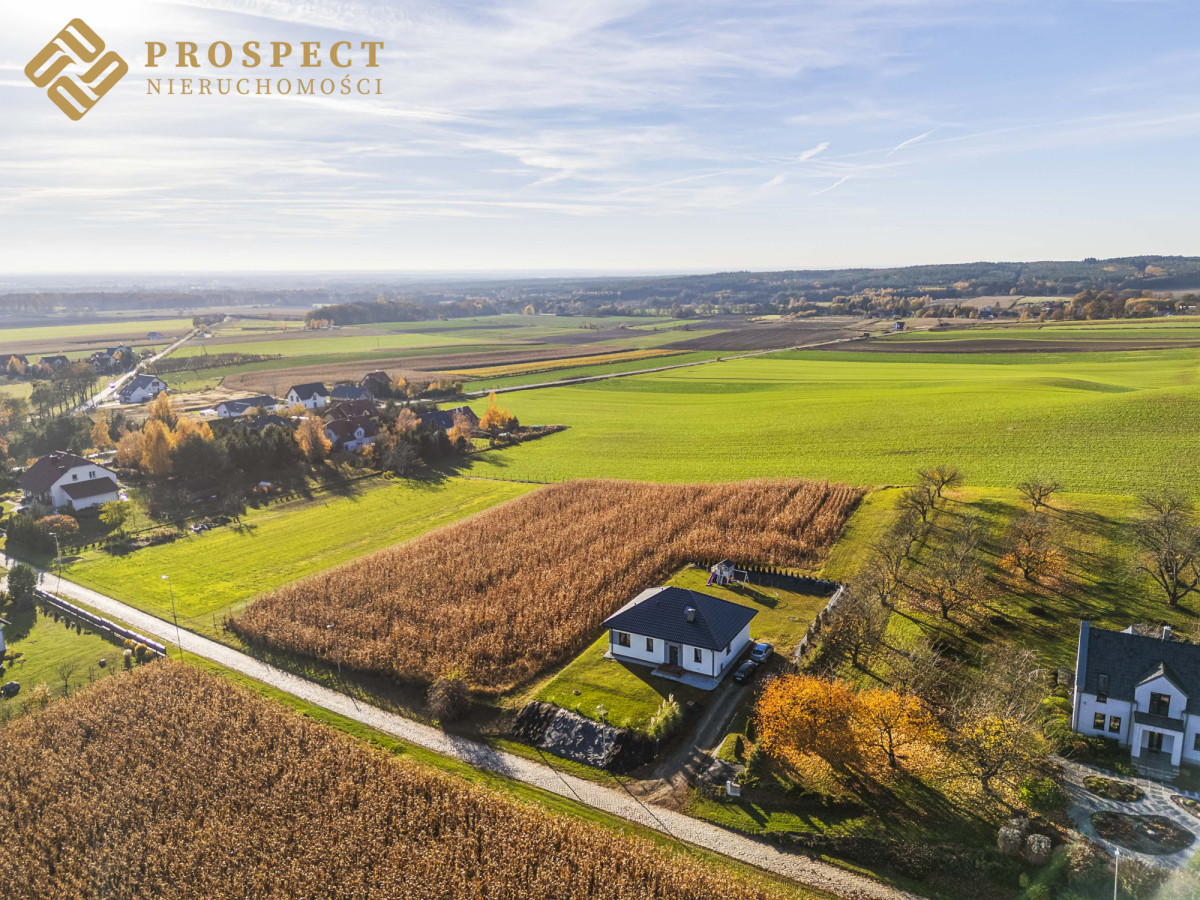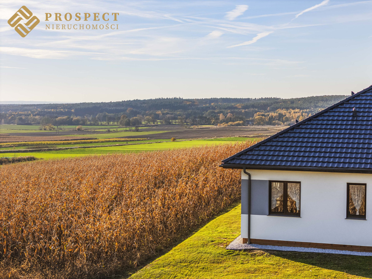 Dom położny w spokojnym, cichym miejscu. Posiadający niesamowite widoki na chroniony krajobraz Wzgórz Trzebnickich, sąsiadujące pola, pasma zieleni i góry. Nowocześnie i gustownie wykończony, wyposażony w ogrzewanie podłogowe.
