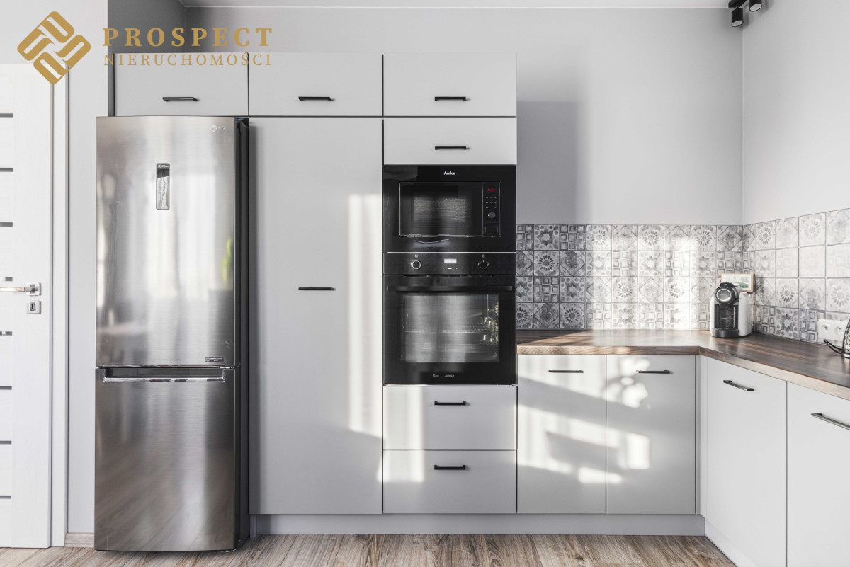 W kuchni meble wraz ze wszystkimi sprzętami AGD: lodówko - zamrażarka, zmywarka, piekarnik, płyta gazowa, okap.