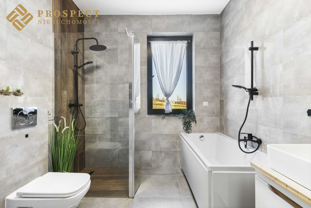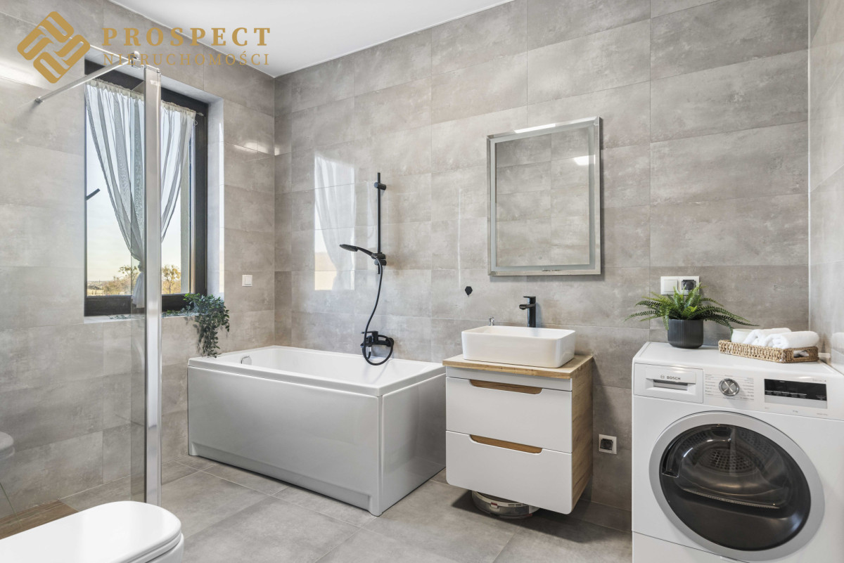 - łazienka wyposażona w wannę, kabinę prysznicową, umywalkę, toaletę i pralkę
