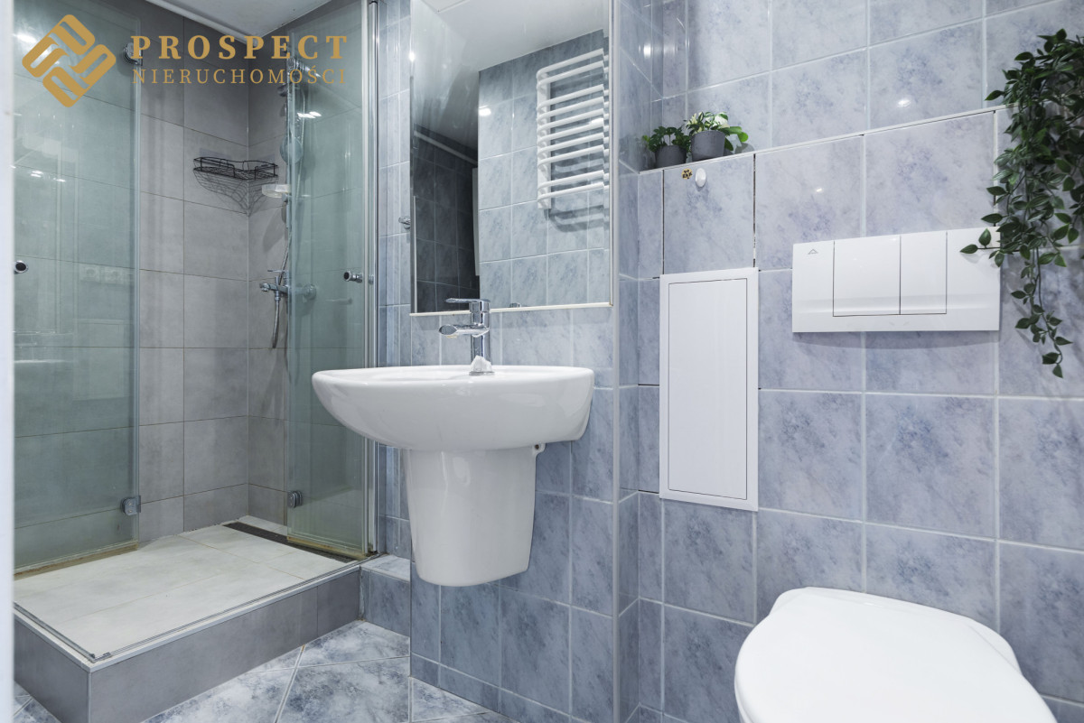- łazienki wyposażonej w kabinę prysznicową, umywalkę, pralkę i wc