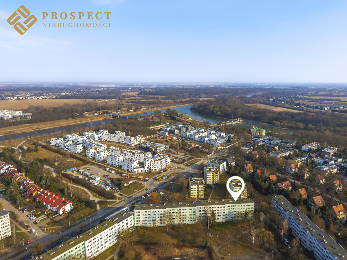 Mieszkanie o powierzchni 56 m2 z dwustronną ekspozycją okien, znajduje się na 4 piętrze w zadbanym bloku na spokojnym osiedlu, położonym zaledwie 300 m od terenów zielonych i wałów rzeki Odry.