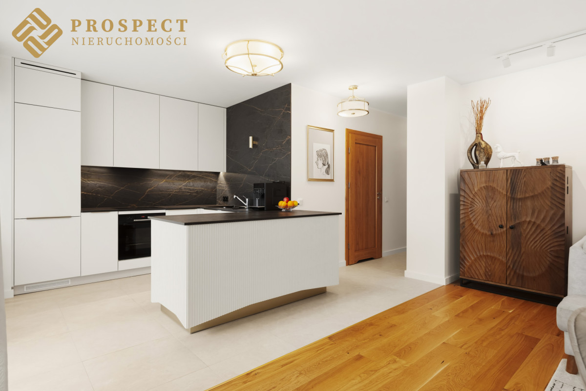 Kuchnia robiona na zamówienie, nowoczesne fronty, blaty wykonane z wysokiej jakości spieków kwarcowych. Na podłodze drewniany, dębowy parkiet.