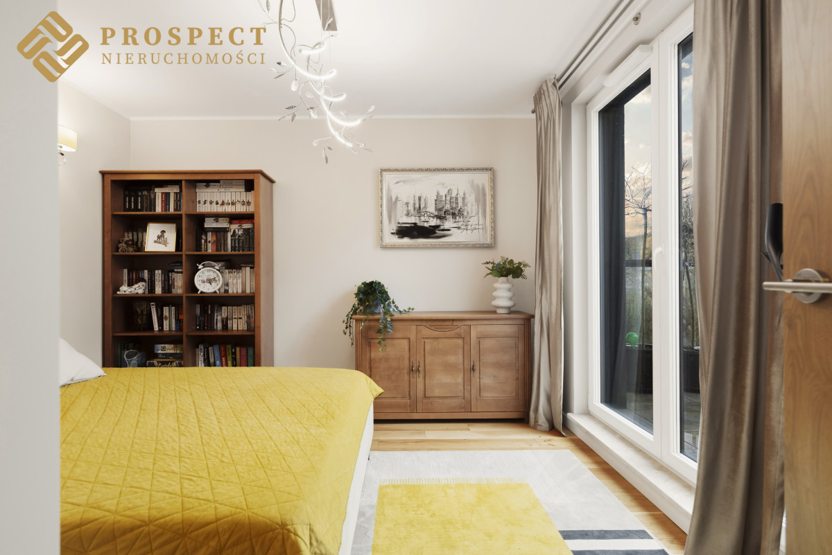 - sypialnię z miejscem na łózko i dużą szafę w zabudowie z której wychodzimy na kolejny mniejszy taras
