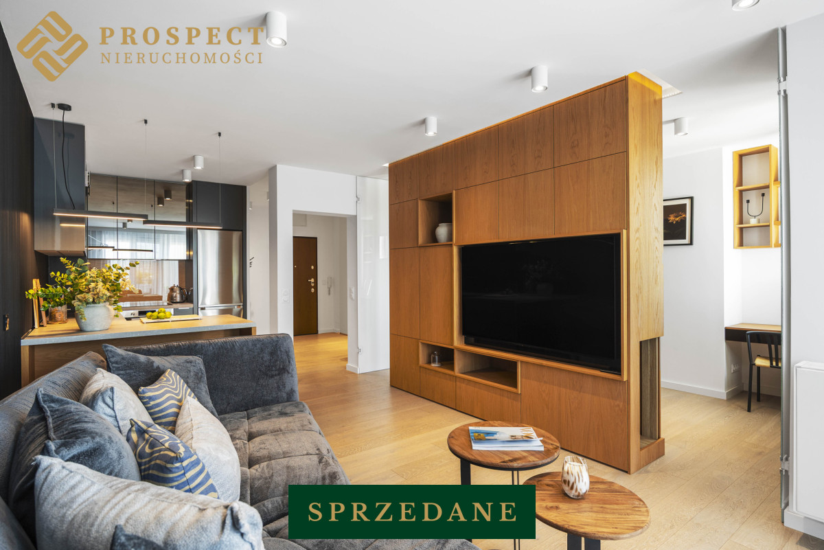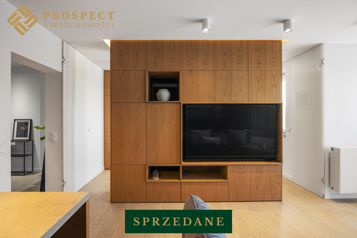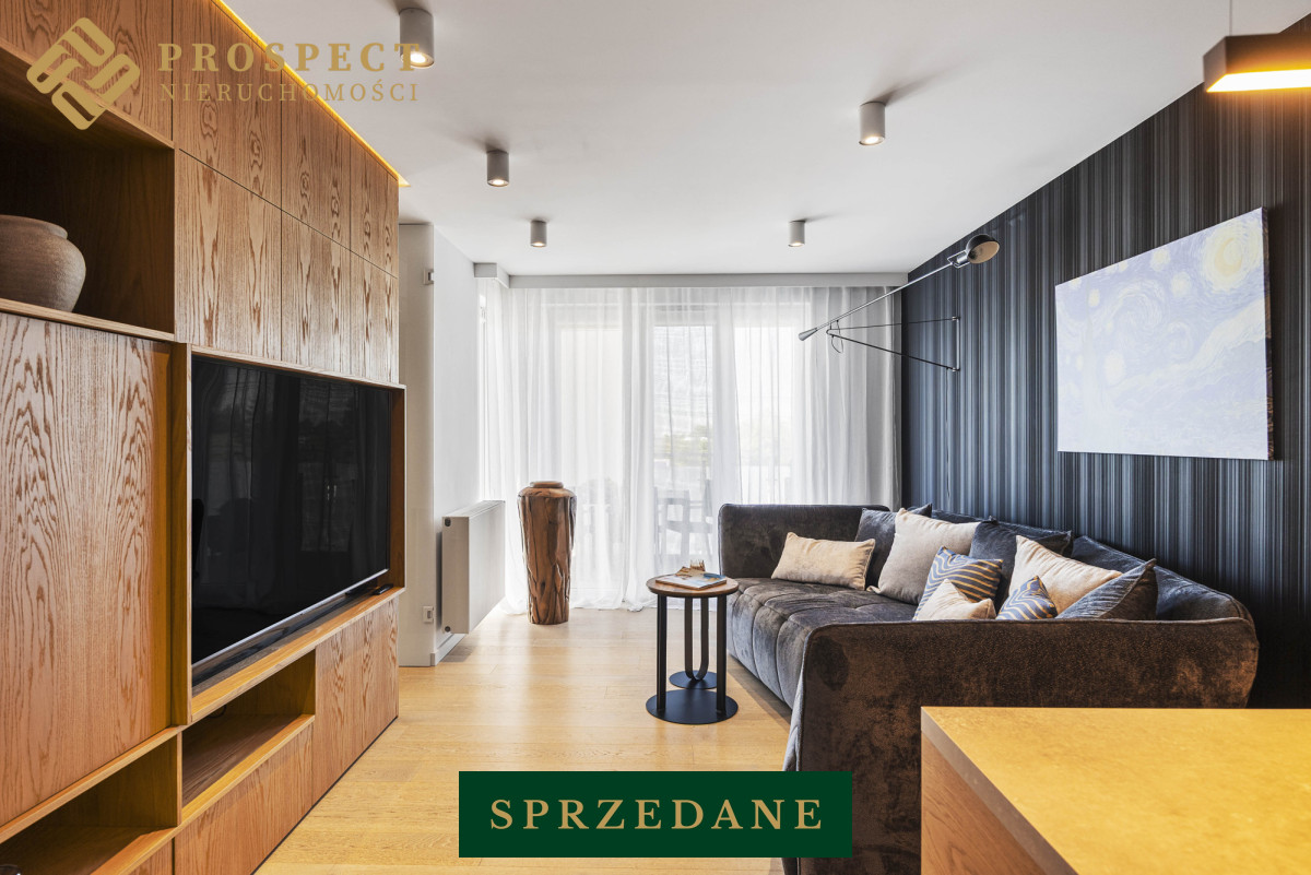 Wnętrze zachwyca wysokiej jakości wykończeniem - drewniane podłogi, kuchnia na wymiar, włoska sofa, winylowa ściana w salonie oraz liczne ukryte półki i zabudowy.