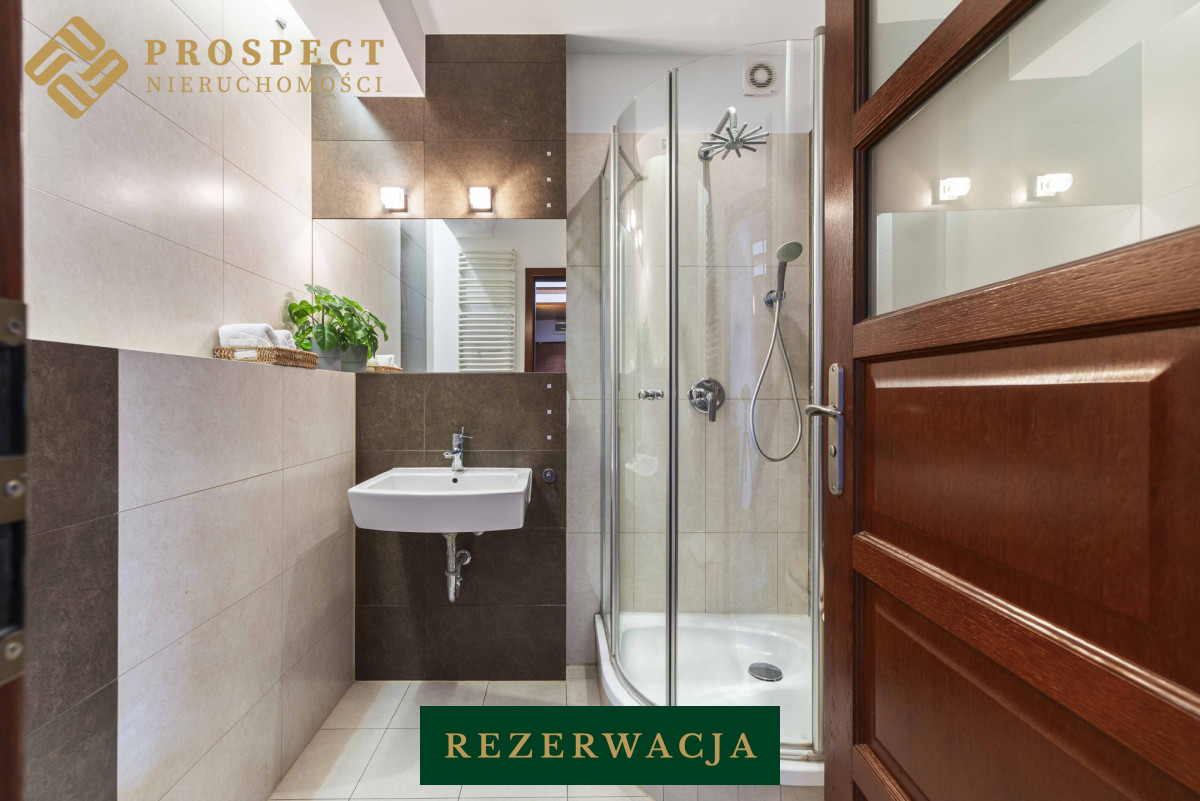 - łazienka z kabiną prysznicową, umywalką, pralką i wc